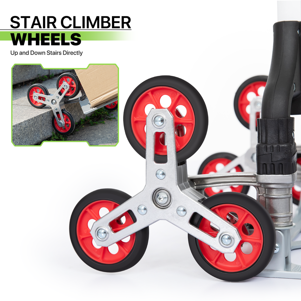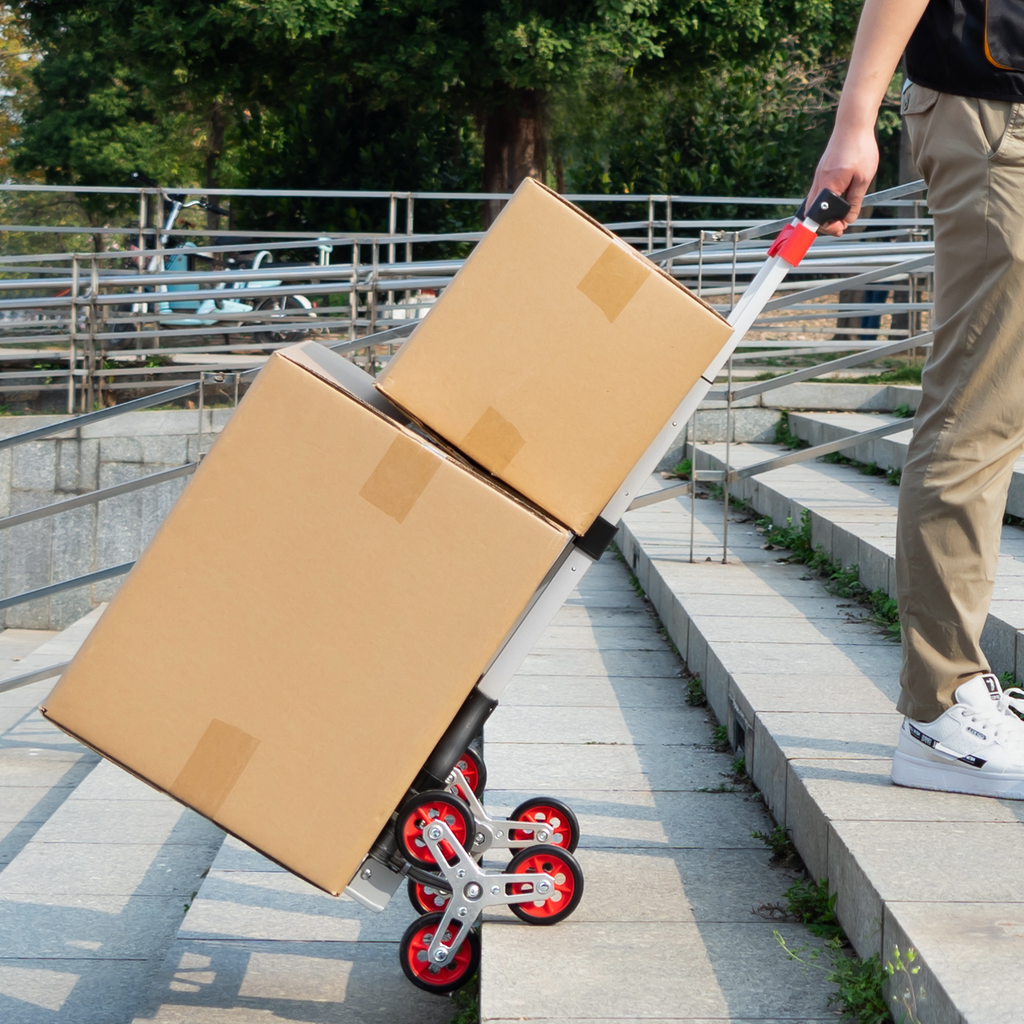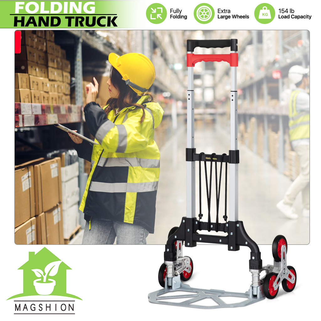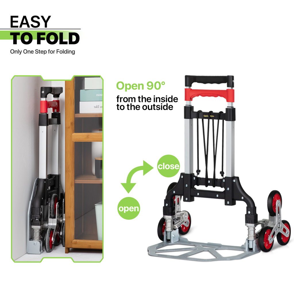 A portable hand truck is an upright聽"L" shaped handcart with 6 climbing wheels, made of sturdy aluminum alloy frame, a telescoping handle at one end and a small flat ledge at the bottom that allows you to set objects on. A folding hand truck is a more recent innovation of a hand truck; the only key difference between the two is that when the truck is not in use you can fold up the toe plate and the wheels to reduce space. This is great to keep on a work van or truck that is generally full with inventory because it can be folded flat and not take up a lot of precious space on the vehicle. It can be used as a stair climbing cart to save effort when moving up and down stairs or served as cargo cart for industrial applications.