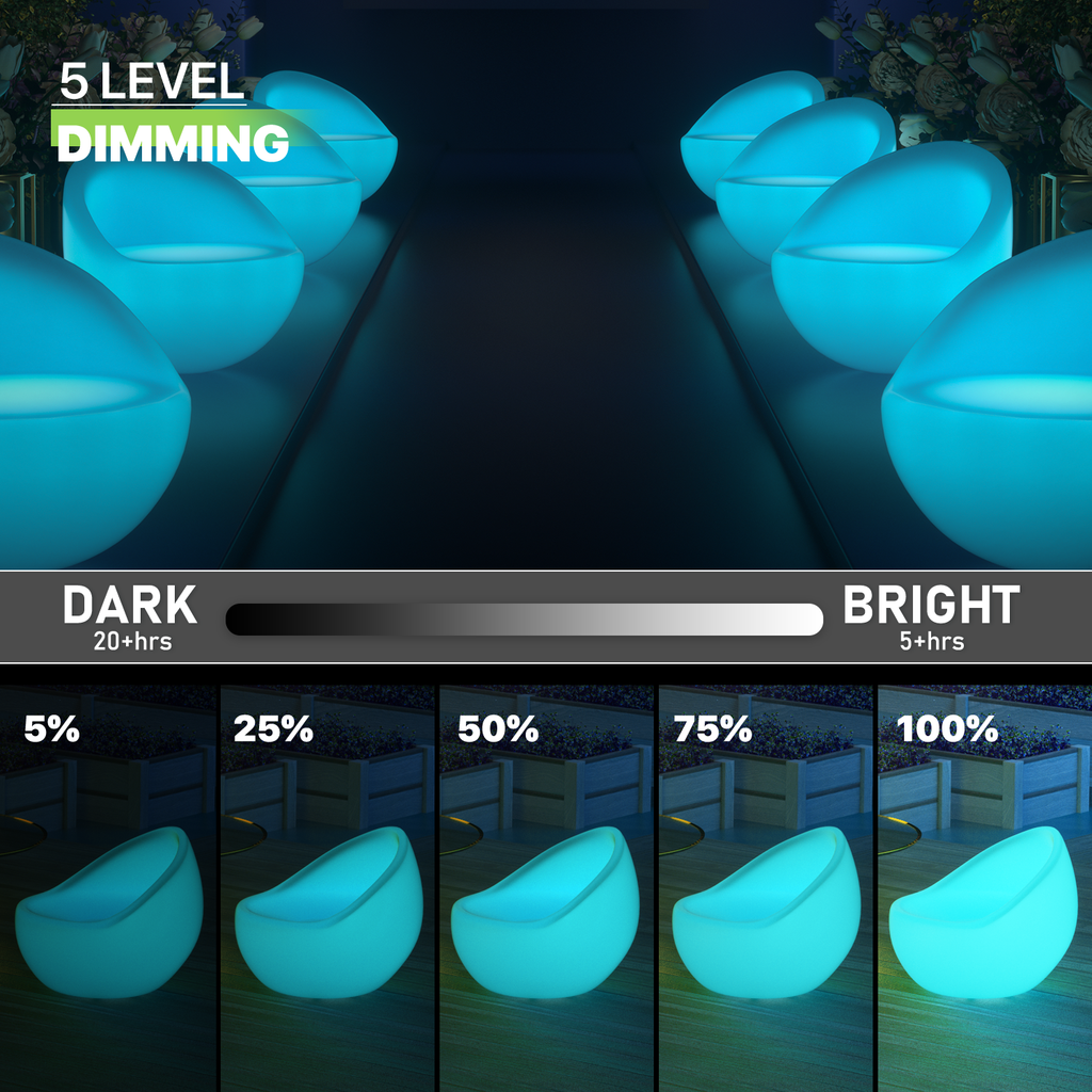 This LED atmosphere light chair creates the perfect lighting for your home, party or wedding, with rechargeable batteries inside for indoor and outdoor use. Whether it's to keep your room illuminated all night long or to decorate your house or garden. 16 kinds of bright colors, just press the button on the universal remote control to watch the color change and flash. Or keep your favorite color static and make it fit any room.
